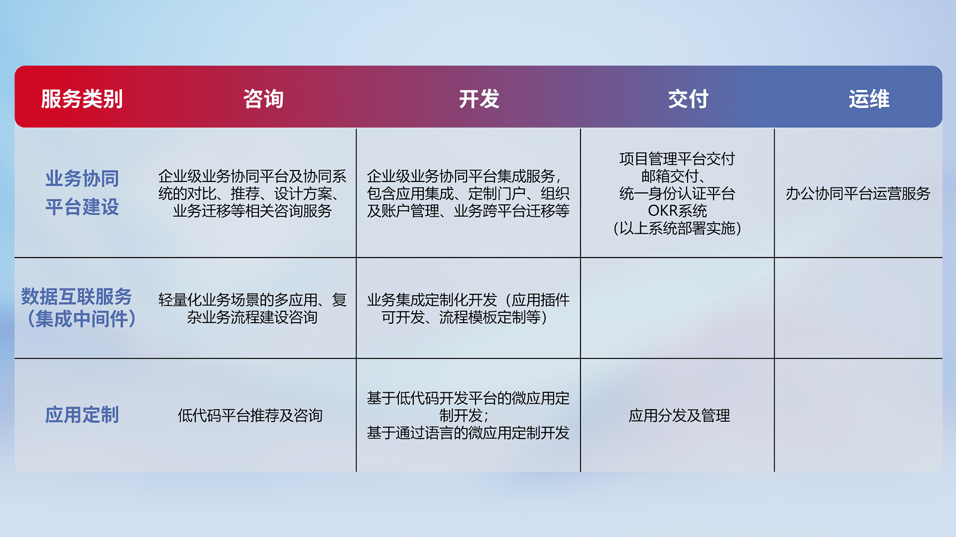 针对钉钉、、企微、、IDaas等平台级产品提供产品的规划、、、、方案、、、交付、、、定制化开发等服务,,,实现如统一协同办公、、、、智能客户服务、、、混合会议管理、、智能数据查询、、等业务场景,,,实现数字化转型。。